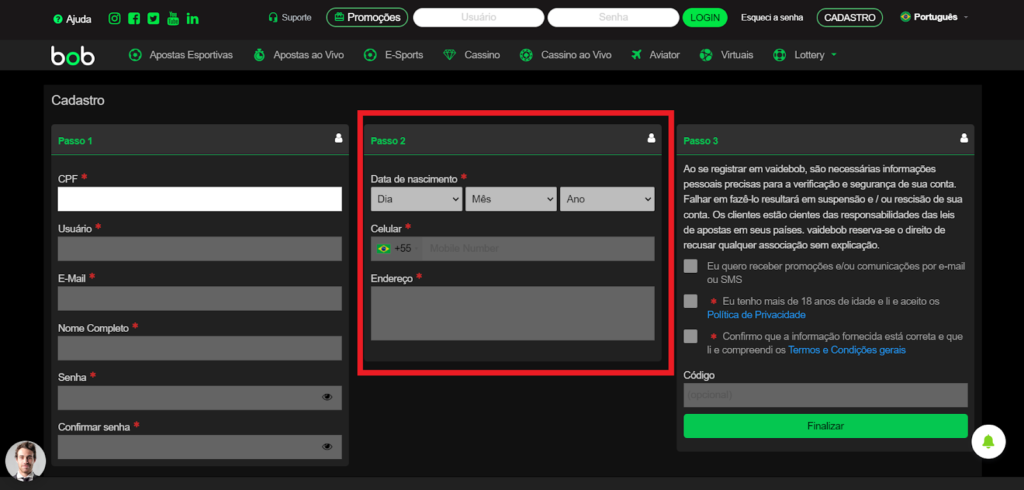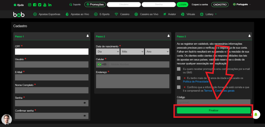 - Clique no botão “Finalizar” para concluir o seu cadastro na Vai de Bob Brasil.