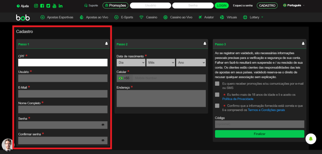 Somente quem é registrado poderá fazer Vai de Bob apostas. Por isso, é importante que você conheça como abrir a sua conta nessa casa de palpites esportivos. Os passos para a criação do seu perfil são os seguintes: