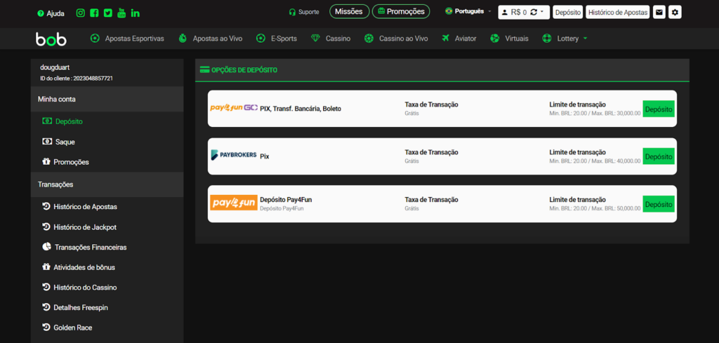 Os depósitos na Vai de Bob podem ser realizados com Pix ou Pay4Fun. Os valores depositados deverão estar entre R$ 20 e R$ 50.000.