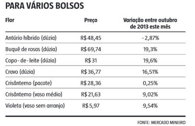 Pesquisa do Mercado Mineiro indicou que o preço da flor mais procurada, o vaso de crisântemo, pode variar 680%, sendo encontrado entre R$ 10 e R$ 78. Os preços da dúzia de rosas variam 180%, de R$ 45 até R$ 126. O custo para o consumidor do pacote de crisântemo também pode variar 286%. O produto é encontrado entre R$ 15 e R$ 58.