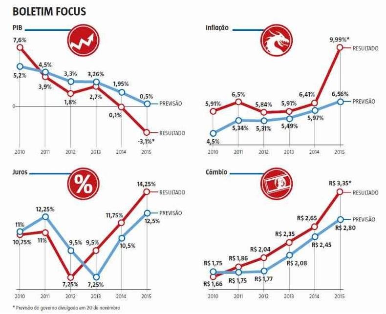 O Estado de Minas comparou as primeiras edições do boletim Focus de 2010 a 2015 com os resultados efetivos registrados em cada ano para quatro indicadores: PIB, inflação, juros e câmbio. O comparativo confirma que a bola de cristal dos economistas não conseguiu prever a profundidade da crise. Nos últimos quatro anos, os 100 economistas consultados pelo Banco Central projetaram resultados melhores para o PIB que o efetivado. Em 2014, a expectativa era de crescimento de 1,95%, enquanto a variação real foi de 0,1%; um ano antes, era esperada expansão de 3,26% da economia e confirmou-se 2,7%. Em 2012, o relatório projetava alta de 3,3%, bem superior à verificada, de 1,8%.