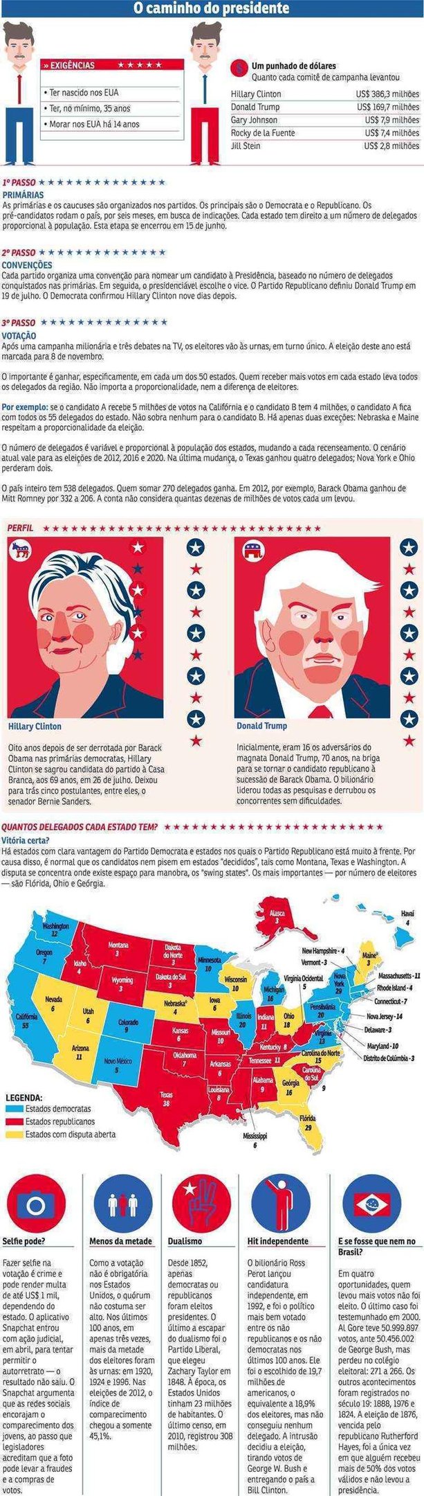 A votação desta terça-feira, que levará Donald Trump ou Hillary Clinton à Casa Branca, é o desfecho de um processo complexo, que dura desde o início do ano. O sistema americano, de voto por meio do colégio eleitoral, foi criado no século 18 pelos fundadores dos Estados Unidos, que se diziam preocupados com a possibilidade de os cidadãos não terem bom julgamento no momento de eleger seu presidente.