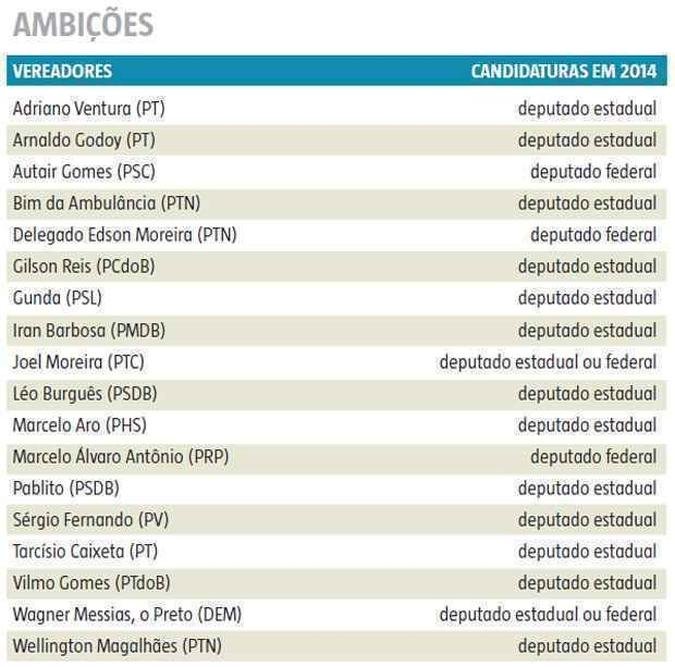 Vereadores mais experientes, como o presidente da Câmara, Léo Burguês (PSDB), no terceiro mandato; o líder do prefeito, Wagner Messias, o Preto (DEM), no quinto mandato; e o 1º vice-presidente da Câmara, Wellington Magalhães (PTN), em seu terceiro mandato, também trabalham para turbinar a carreira política no ano que vem. Caso tenham sucesso eleitoral, anuncia-se uma completa reconfiguração das forças políticas no Legislativo municipal.