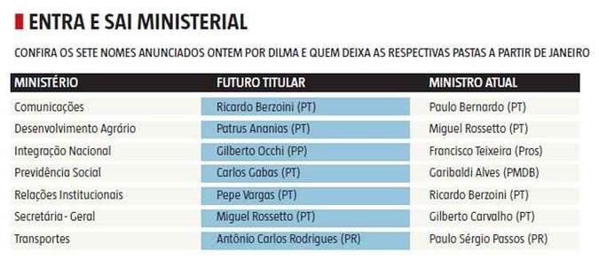 A lista não trouxe surpresas. A presidente acatou as indicações feitas por PP e PR – Gilberto Occhi e Antônio Carlos Rodrigues, respectivamente. No primeiro caso, os pepistas optaram por um técnico, pela dificuldade em escolher um nome do Nordeste para ocupar a pasta. Ficaram com Occhi, filiado ao partido, mas com carreira ligada à Caixa Econômica Federal.