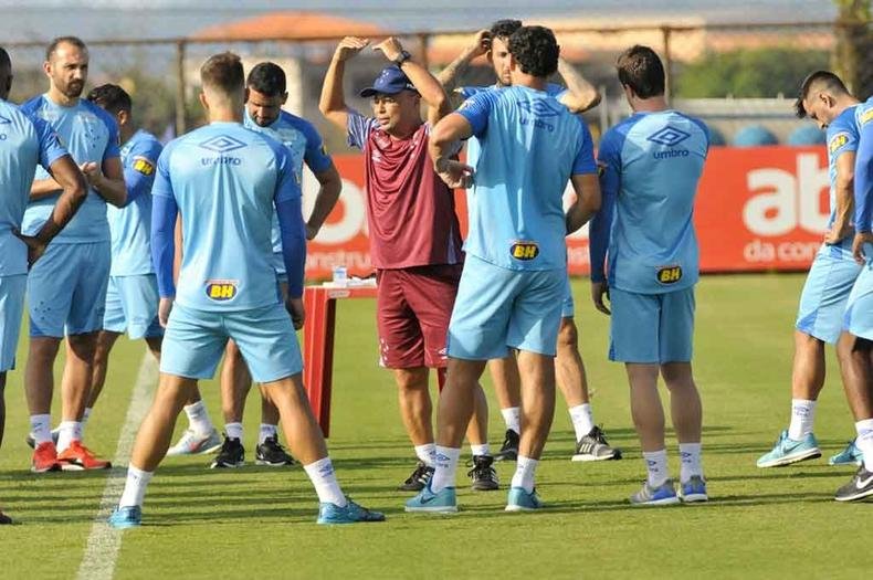 Os atletas celeste estiveram em campo em dois períodos ontem. Pela manhã, houve trabalho físico-técnico em campo. À tarde, academia e trabalho físico novamente no gramado. O preparador físico Eduardo Silva (c) vem exigindo bastante de todos, o mesmo fazendo o preparador de goleiros Robertinho.