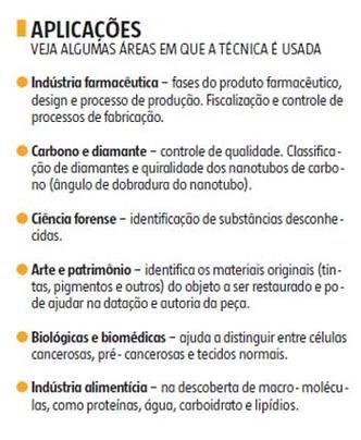 No Triângulo Mineiro, na Universidade Federal de Uberlândia (UFU), os cientistas têm usado a técnica para conhecer se polímeros (moléculas longas constituídas de unidades que se repetem) e oligômeros (são moléculas relativamente grandes, mas que ainda não apresentam a propriedade de polímero) são bons condutores ou não, e também para avaliar suas formas geométricas. Segundo explica a coordenadora do Laboratório de Espectroscopia de Materiais da universidade, a professora Raigna Augusta da Silva Zadra Armond, o método é conceituado como caracterização estrutural de materiais. “Ao conhecermos as propriedades dos polímeros e oligômeros, colaboramos no estudo de dispositivos, como para os celulares. A técnica é poderosíssima, principalmente para a nanotecnologia.”