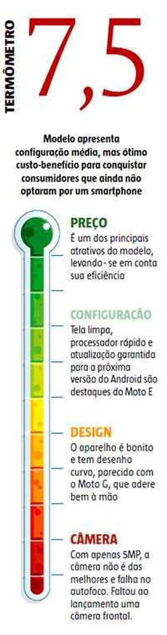 Com os novos modelos lançados, a Motorola mostra que é perfeitamente possível oferecer aos usuários equipamentos dignos, com Android, e cobrar relativamente pouco em relação aos seus concorrentes. O Estado de Minas testou o Moto E para comprovar que, realmente, trata-se de um bom equipamento, com hardware bastante razoável e que custa menos de R$ 600. Já tínhamos testado o Moto G e, para você, que pode estar em dúvida sobre qual modelo escolher em uma possível ideia de compra, podemos dizer que o aparelho lançado no ano passado ainda se mantém como uma melhor opção, particularmente por apresentar processador e tela superiores. Além disso, sua versão mais barata é apenas R$ 50 mais cara do que o melhor Moto E (com TV digital) e tem ainda o dobro de armazenamento (8GB no Moto G contra 4GB no Moto E). Sendo assim, a não ser que você esteja somente à procura de um smartphone da categoria intermediária para assistir à TV, a melhor escolha é o Moto G, especialmente a versão mais nova, com 4G. No comparativo dos testes, ele ganhou do irmão mais novo, embora não com vantagens tão amplas. (SS)