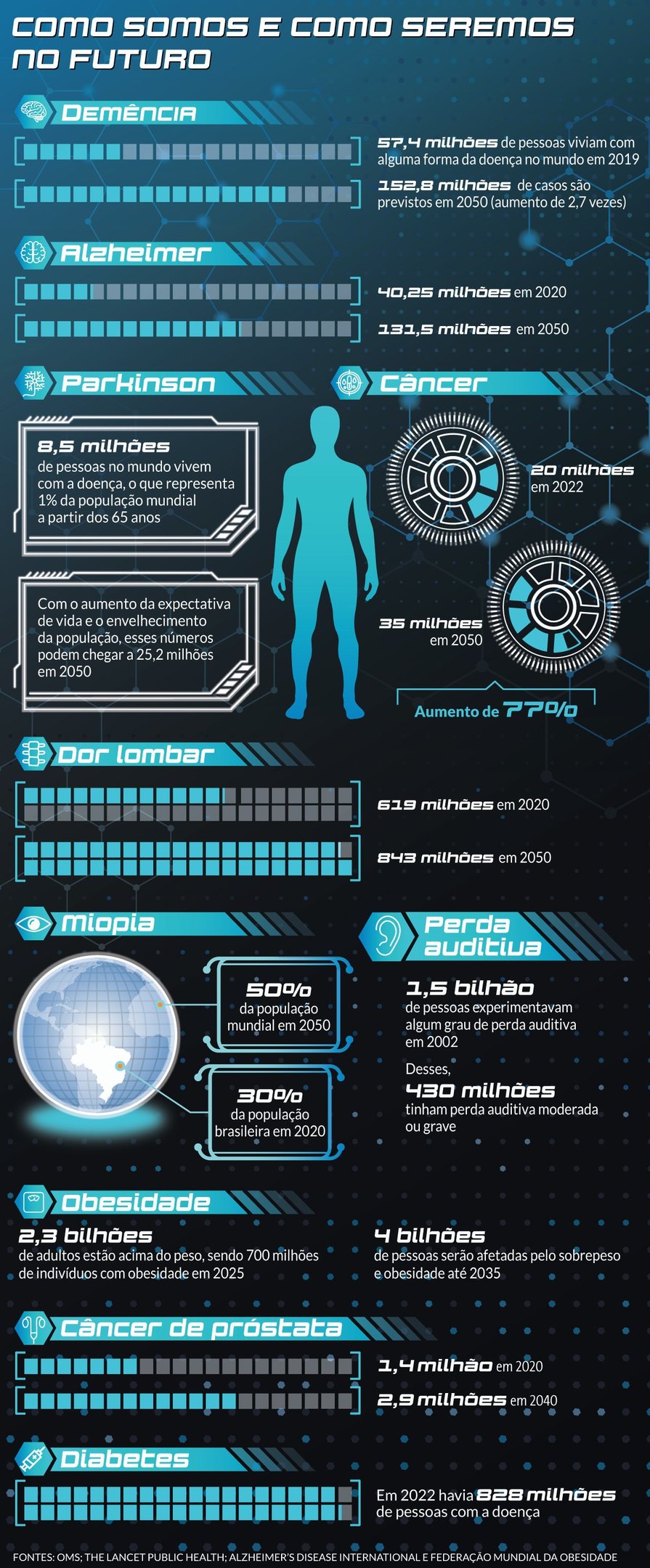 Mas os números não param por aí. De acordo com a OMS, o câncer aumentará em 77% - serão 15 milhões de doentes a mais do que o registrado em 2022 (20 milhões), ou seja, uma em cada cinco pessoas desenvolverá câncer ao longo da vida; um quarto da população global - cerca de 2,5 bilhões de pessoas - viverá com algum grau de perda auditiva em 2050.