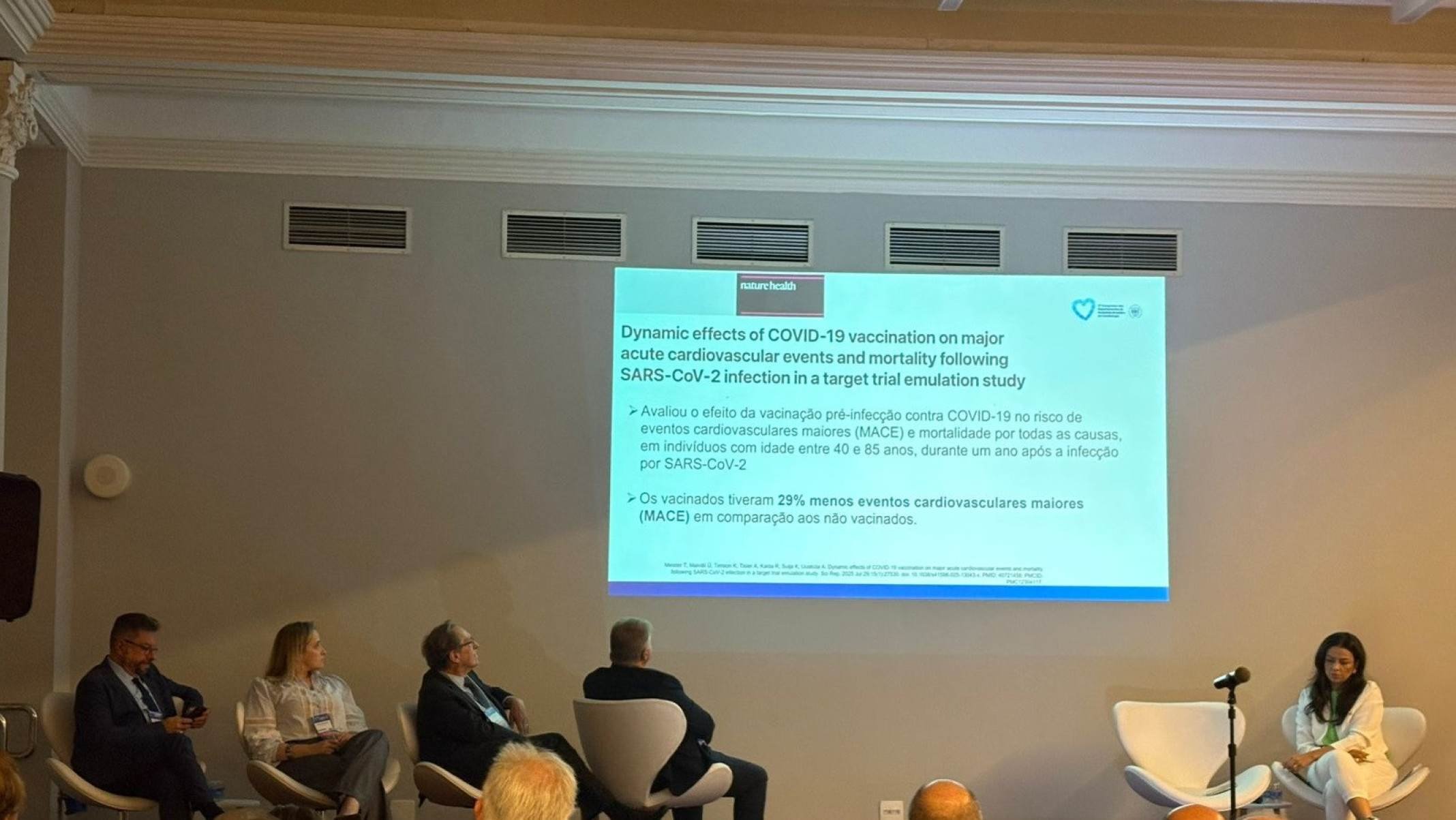 “Vimos, na pandemia, um aumento importante no risco de eventos cardiovasculares, como na COVID-19. Um estudo da Nature mostra uma redução de 29% de MACE [eventos cardíacos adversos maiores] em pacientes vacinados, em comparação com os não vacinados, além de uma redução de 68% na mortalidade entre aqueles que se vacinaram contra a COVID, apesar de toda a polêmica e discussão que ainda existe sobre a vacinação”, explica.