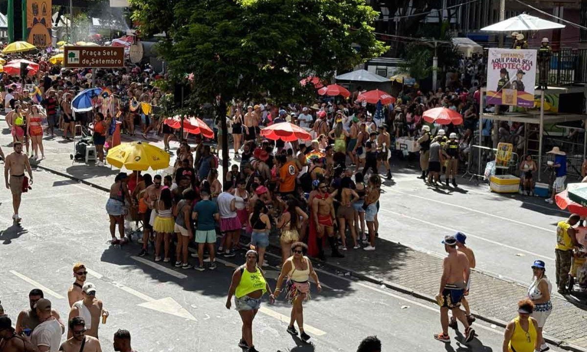 Antes do meio-dia, também no sábado (14/2), o quarteirão fechado da Rua dos Carijós esteve o tempo todo lotado. Mas, ali, a ‘desculpa’ não era apenas a sombra dos prédios ao redor. Para os que tinham muita energia, a programação do Carnavaranda, projeto do Cine Theatro Brasil, que vai até terça-feira (17/2), com 21 atrações, das 9h às 17h, é sopa no mel. Impressionante como ninguém para ao som de DJs ou bandas. É uma energia de dar inveja.