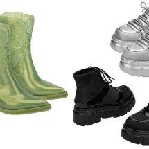 botas, que além do couro craquelado, também apresentam elementos modernos nas duas versões: cano alto com salto bloco e cano médio com salto kitten heel. Outras grandes apostas são as maxi studs, que trazem a estética rocker, modelos com pelos, e peças atemporais, como a sandália de tiras finas e o loafer com linhas marcadas.