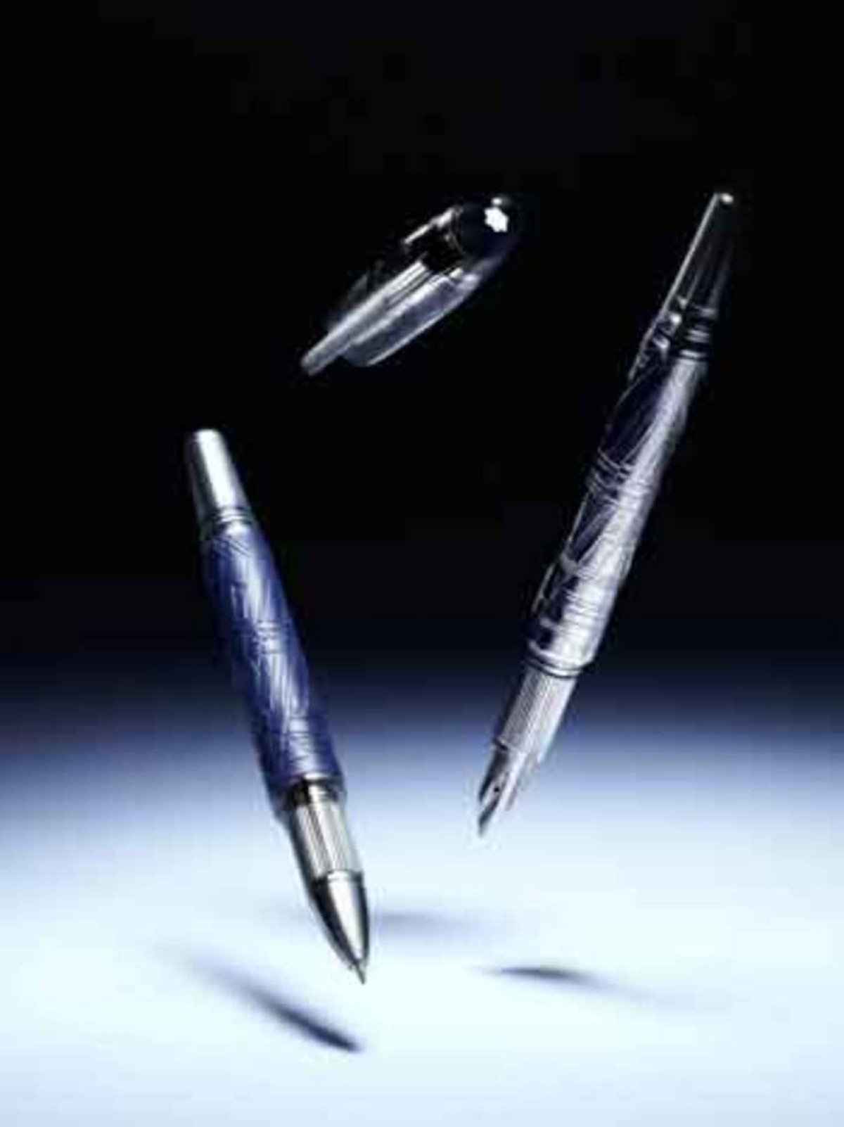 Outra opção é a StarWalker Doué. Especial para quem deseja deixar a sua marca no mundo, o instrumento de escrita inspira-se no fascínio da humanidade pelo espaço. Esta visão foi recriada com a tecnologia do emblema StarWalker, que apresenta uma cúpula azul translúcida abaixo do emblema Montblanc na parte superior da tampa, lembrando a Terra emergindo acima do horizonte lunar. A versão fineliner vem com tampa e acessórios revestidos de platina e corpo de resina preciosa preta.