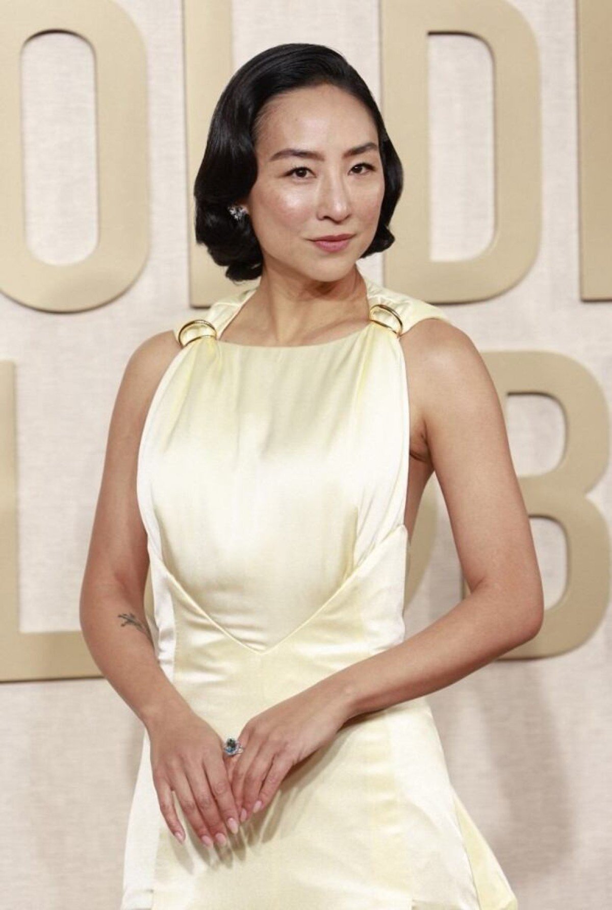 Greta Lee arrives, no tapete vermelho do 81º Globo de Ouro