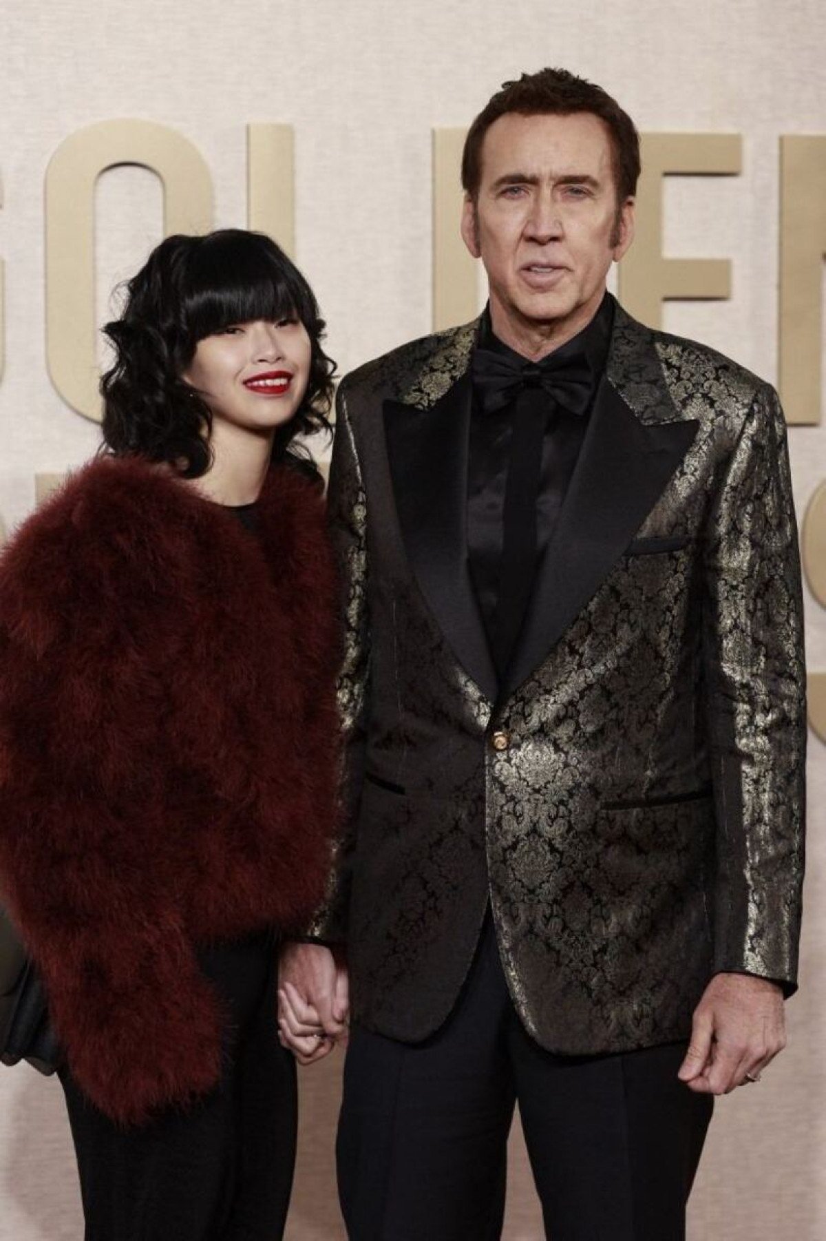 Nicolas Cage e Riko Shibata no tapete vermelho do 81º Globo de Ouro