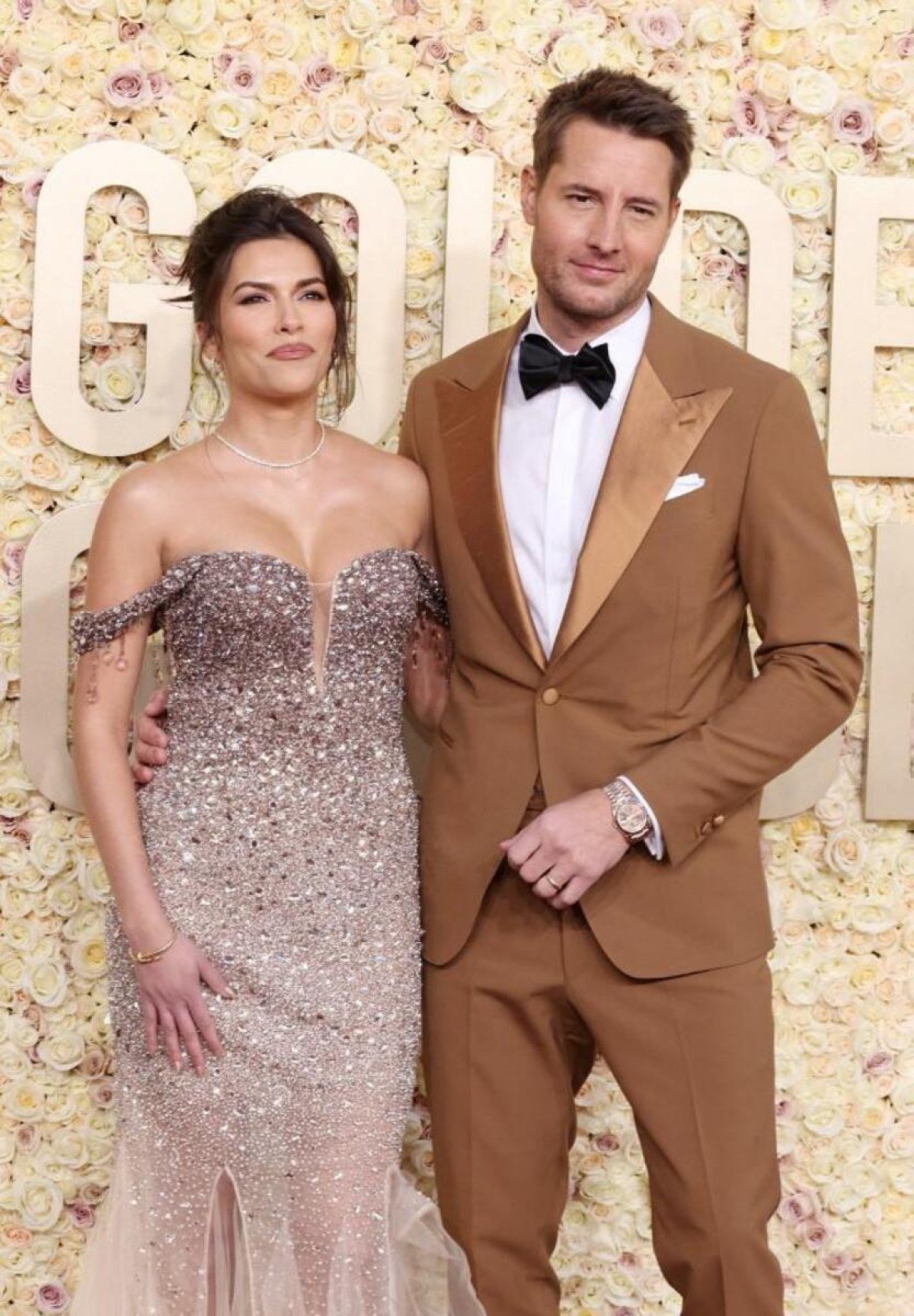 Sofia Pernas e Justin Hartley, no tapete vermelho do 81º Globo de Ouro