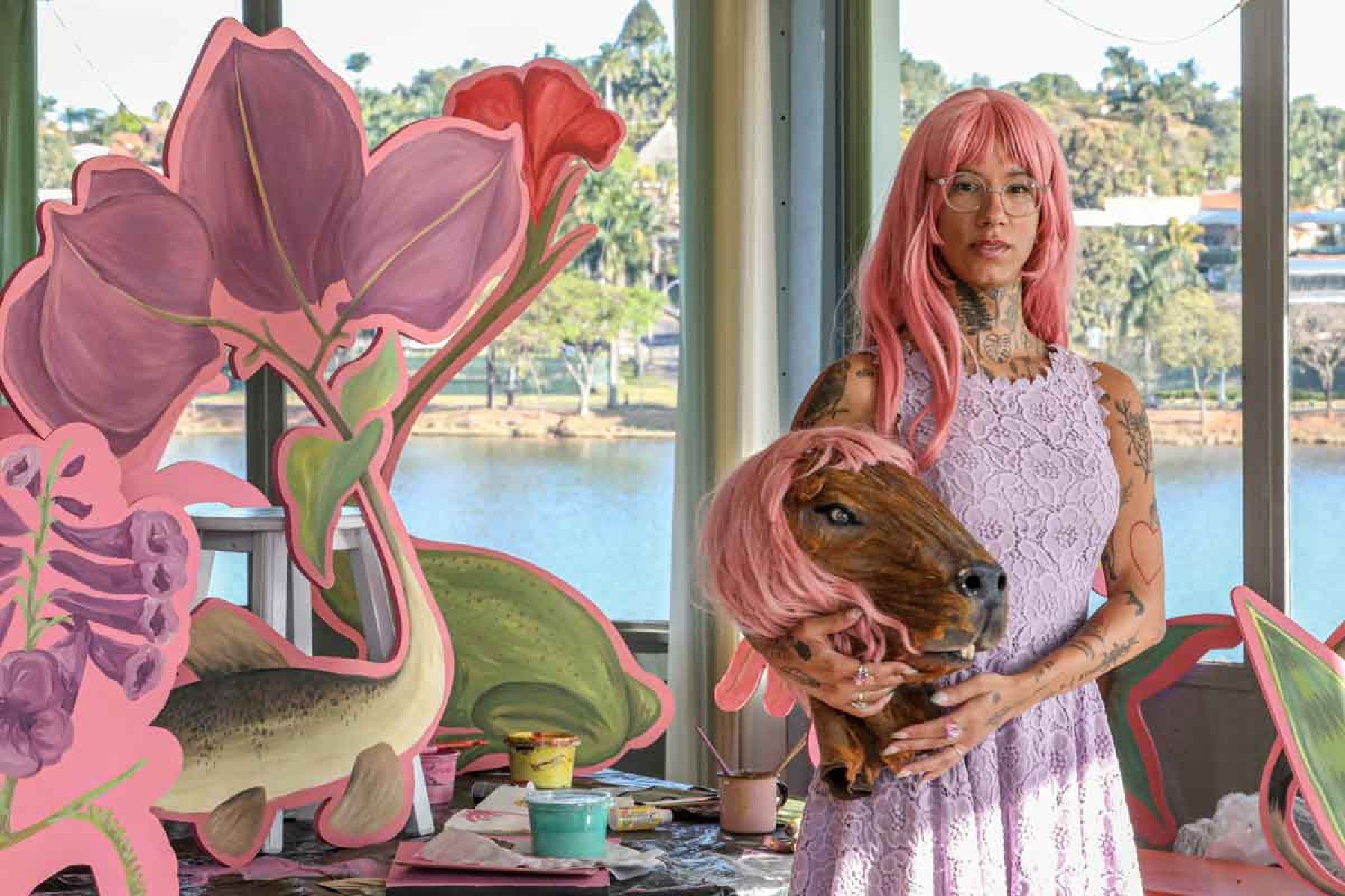 A artista se inspirou em bichos e plantas encontrados na região da Pampulha. “Tudo é muito mais interessante quando está misturado, né?”, provoca Efe. “Esse hibridismo, ou misturas da natureza, como eu chamo, já se tornou quase a marca do meu trabalho. Sinto que transparece também no meu próprio ser, na minha existência e na minha vida, me afirmando como mulher trans”, afirma.