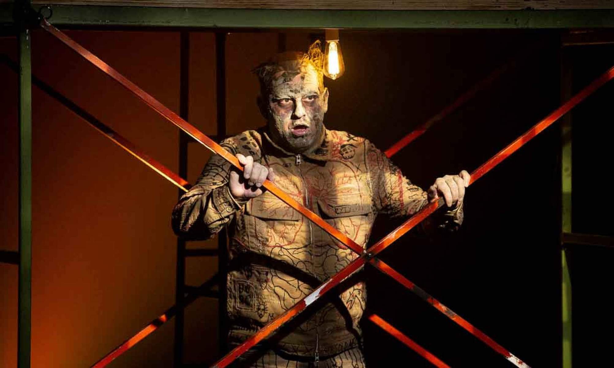 No palco, o ator divide cena apenas com o músico Airon Gischewski, responsável pela trilha sonora executada ao vivo. Irreconhecível pela caracterização, Fernandes dá vida a uma figura fragmentada. Ele manca, arrasta uma perna, um dos braços parece não responder aos estímulos e até o ato de falar se torna um esforço físico e emocional.