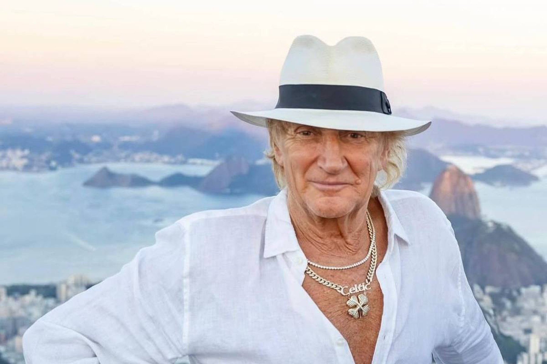 SÃO PAULO, SP (FOLHAPRESS) -O cantor inglês Rod Stewart, 80, curre férias no Brasil e tem curtido o Rio de Janeiro com a mulher, Penny Lancaster, e o filho Alastair Wallace.