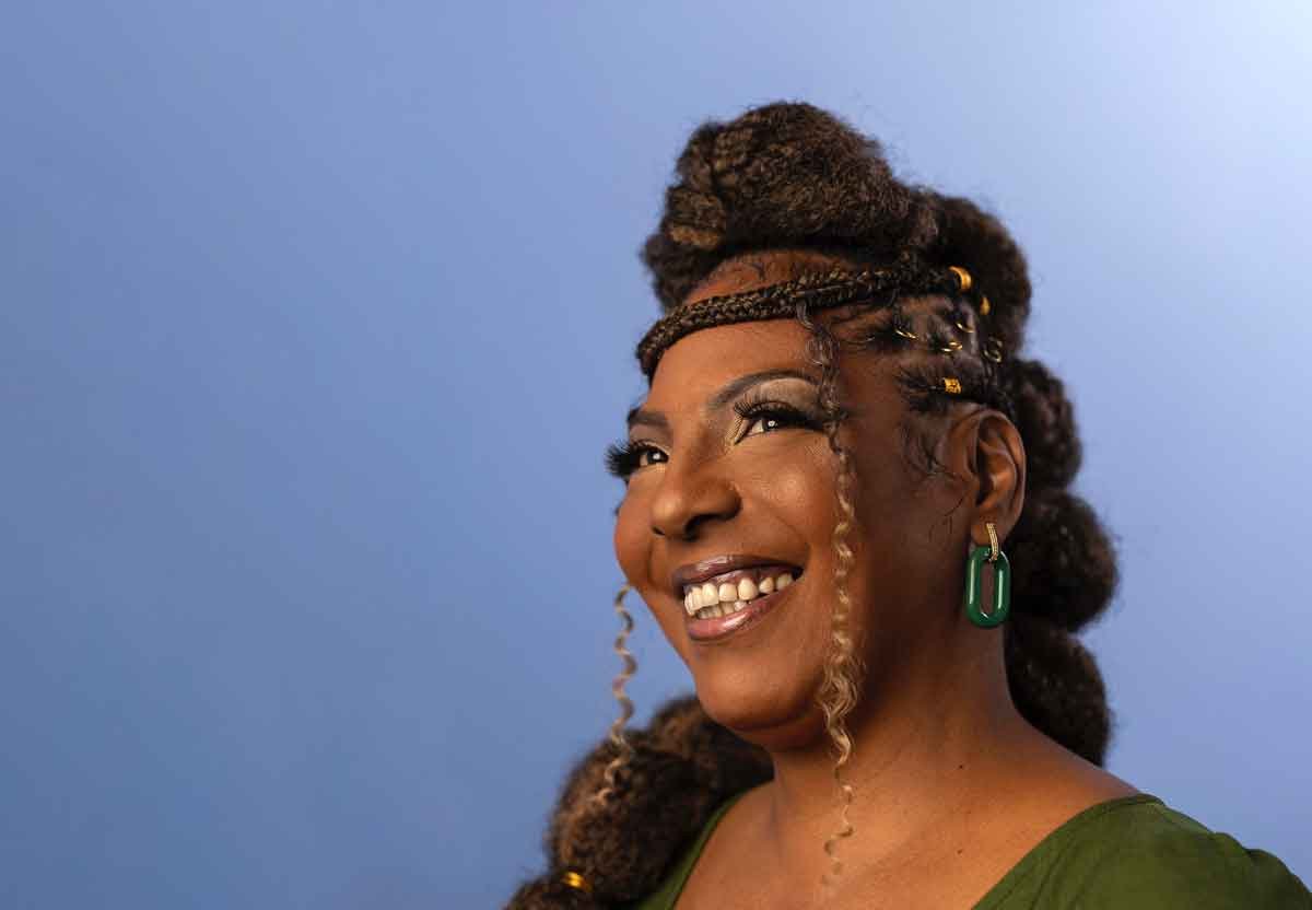Maquiada e de perfil, a atriz Rejane Faria sorri -