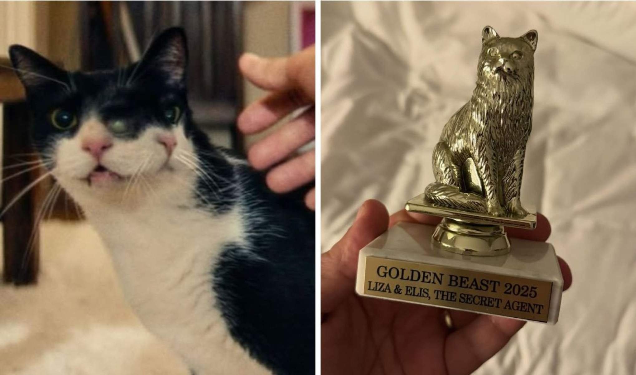 “‘O Agente Secreto’ recebeu um dos grandes e mais prestigiosos prêmios da sua trajetória, The Golden Beast (o bicho de ouro), outorgado pela equipe de programação do Festival de Nova York ao melhor bicho, besta ou criatura destacado num filme. As nossas gatas Liza & Elis ganharam. Recebi finalmente o cobiçado troféu das mãos de Florence Almozini, diretora de Programação. Que emoção”, escreveu o diretor.