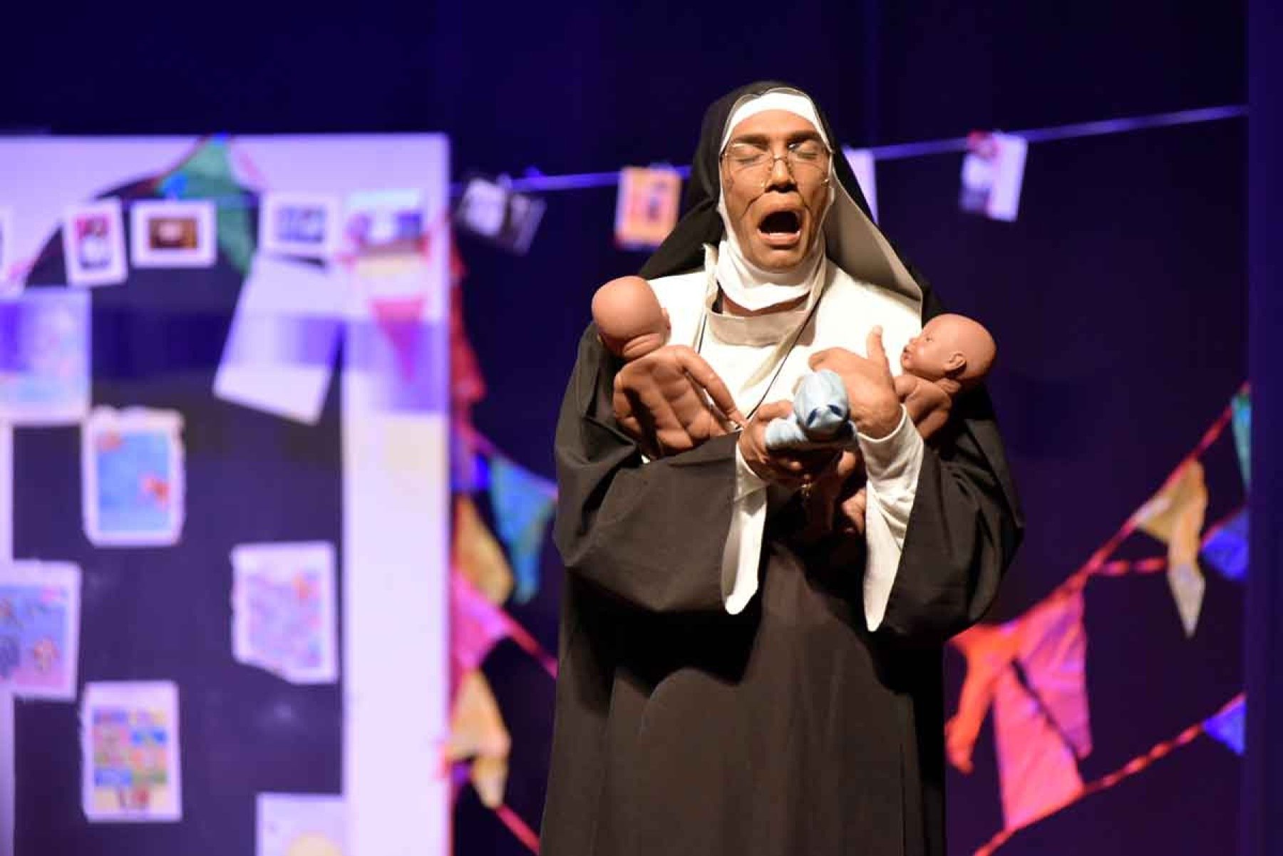 “Nunca fui santa” não ridiculariza o sofrimento da religiosa, mas o apresenta como explicação para aquela personalidade complexa e rígida. No palco, a Madre Superiora dá aula de catecismo, sempre brincando com temas ligados à religião.