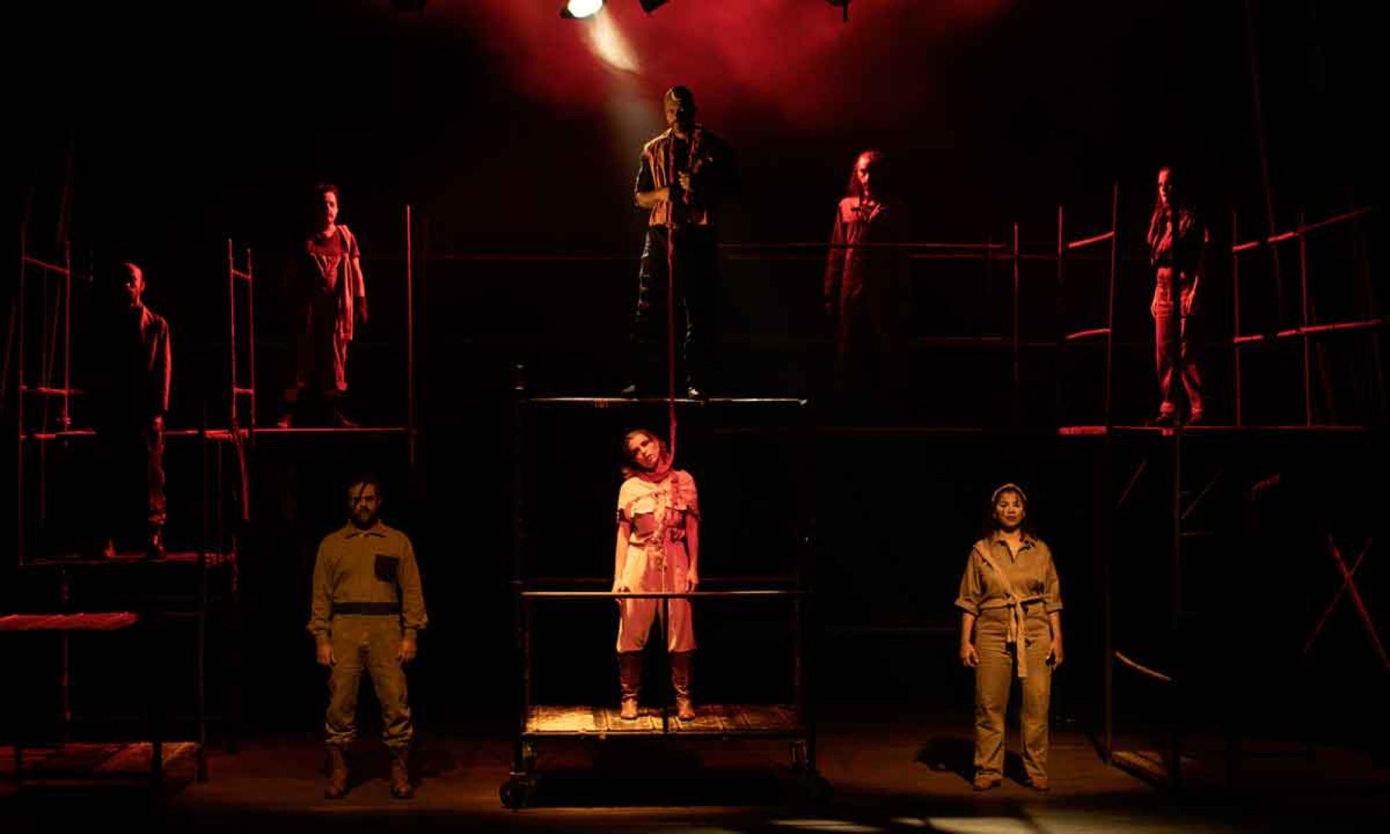 O cenário, composto inteiramente por andaimes, foi pensado para facilitar a circulação da trupe e reforçar a ideia de atemporalidade. “Queríamos trazer uma peça clássica que conseguisse, de alguma maneira, pautar assuntos que ainda permeiam muito nossa sociedade”, afirma Túlio. Para ele, a estrutura metálica permite deslocar a ação tanto para o século 17 quanto para a contemporaneidade.