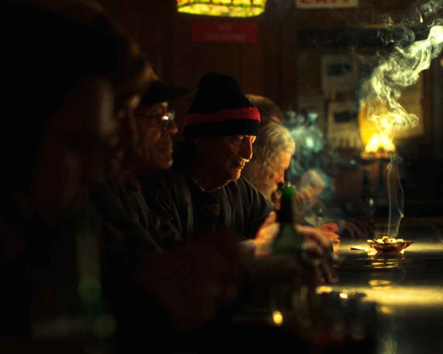 “Os cantores” acompanha homens que se refugiam no bar durante nevasca. Filmado em 35 mm, o ambiente melancólico é dominado por contrastes de luz e sombra.