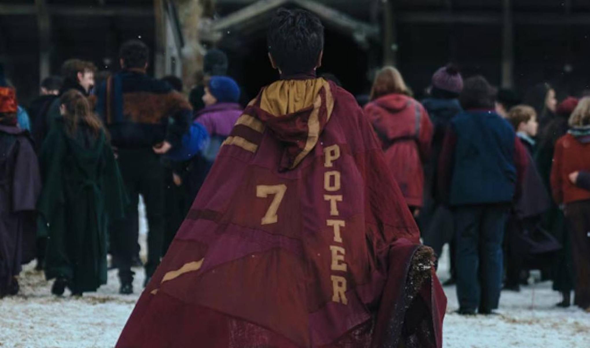 Foto mostra protagonista de costas, com uniforme de quadribol, em cenário de jogo. Produção está em andamento na Inglaterra e tem estreia prevista para 2027