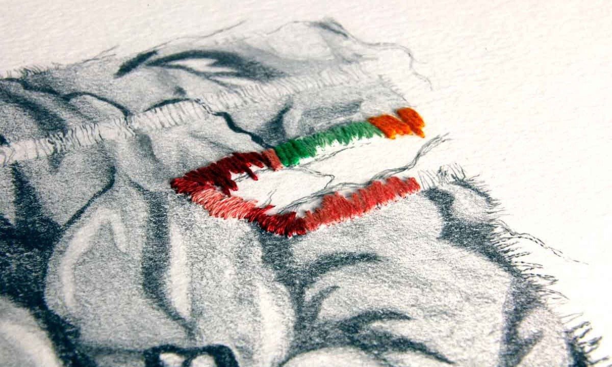 Artista expõe obras que mesclam retalhos, bordado e grafite sobre papel