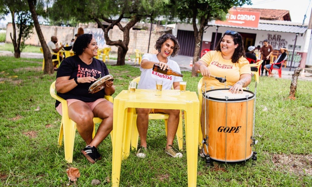Criado em 2023, o Samba das Exaustas surgiu da vontade de ocupar espaços ainda pouco acessíveis às mulheres na cena local. Frequentadoras de uma roda de samba em Sete Lagoas, as integrantes se cansaram de participar apenas como convidadas eventuais. “A gente queria fazer o nosso, não esperar que ninguém chamasse”, conta Rafaela. O grupo começou maior, mas foi se reduzindo até chegar à formação atual de um trio essencialmente percussivo, com pandeiro, surdo e voz.