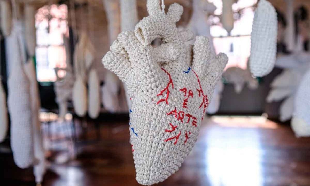 Os rostos esburacados e costurados escancaram um maneirismo latente, que vão se repetir em outras intervenções têxteis e na multiplicação vertiginosa de úteros, ovários e seios, que parecem querer mas não causam nem desconforto nem espanto, pois já vimos isso em muitas outras instalações antes. Os crochês figuram em instalações instagramáveis que obviamente estão cumprindo seu papel nas redes sociais.
