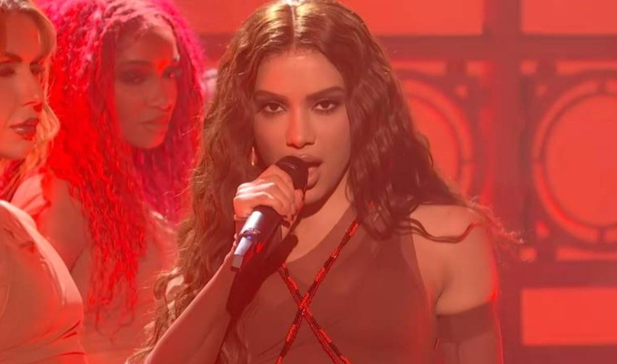 Anitta apresentou "Choka Choka", parceria com Shakira, na qual dança sob batidas de funk e canta trechos em português. O trabalho fará parte de seu novo álbum, "Equilibrivm", lançado a partir deste mês. Ela um colar de guia com miçangas vermelhas e pretas, tradicionalmente associado à proteção, força e equilíbrio de energias nas religiões de matriz africana, como Umbanda e Candomblé.