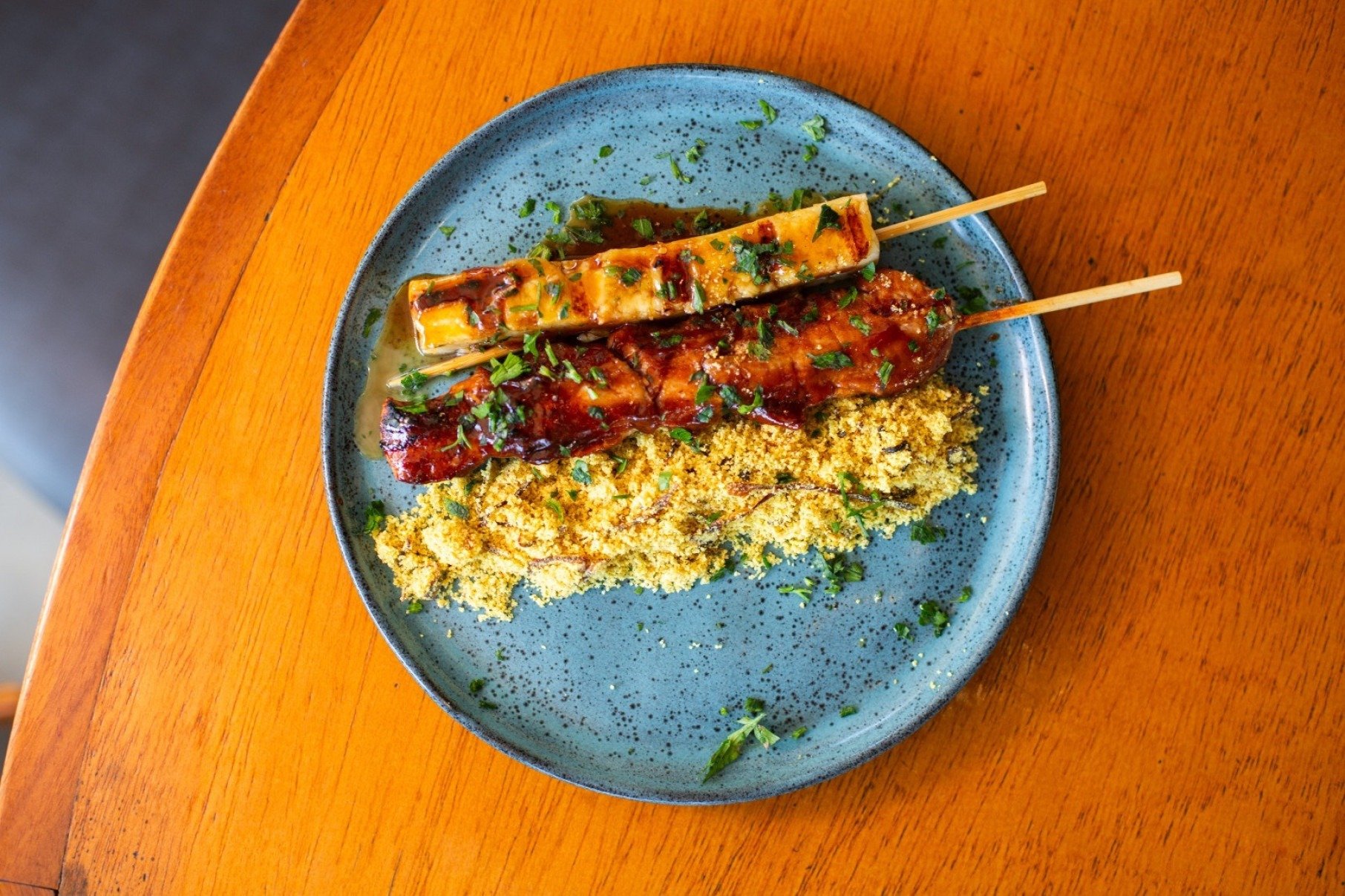 Prato participante: Dueto da Virada – espetinho de frango com bacon e barbecue de goiabada + espetinho de queijo coalho com melaço de cana, acompanhados de farofa de cebola