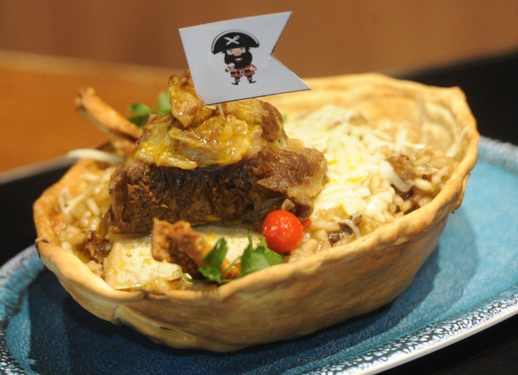 Para o festival, O Barba vai servir o prato “Costela do Capitão Makita” (R$ 41,90), que é um arroz caldoso de costela de boi com queijo servido dentro de um “barco” comestível, feito com massa de pastel. A ideia inicial do chef e proprietário da casa era servir seu prato em um azulejo de Glauber mas, como não seria possível por ser um objeto plano e não “firmar” o preparo, ele optou por trazer Glauber de outra forma para o festival.
