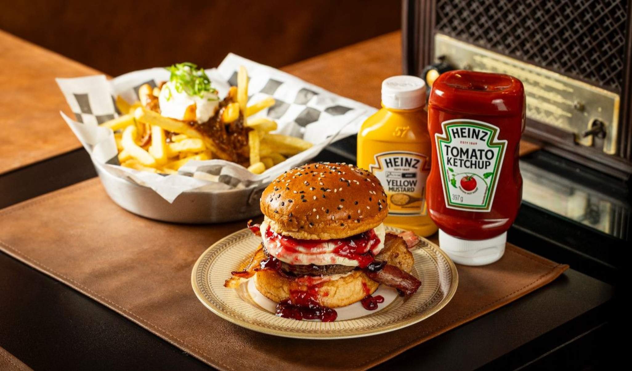 Hambúrguer “Hot Chilli Heinz Burger”: pão brioche selado, burger veg defumado, cebola caramelizada, pimenta jalapeño, rúcula, maionese da casa e ketchup picante.