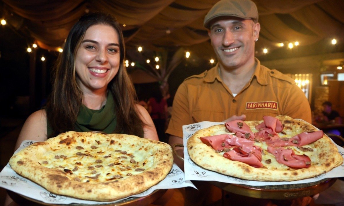 Entre as opções de pizzas, com massa de fermentação natural, serão servidas a Sapucay (R$ 139), com muçarelas de búfala e de vaca, amêndoa laminada tostada e lascas de trufa, e a Sulzbacher (R$ 152), com pera, mel com alecrim, mortadela italiana e trufa em lascas.