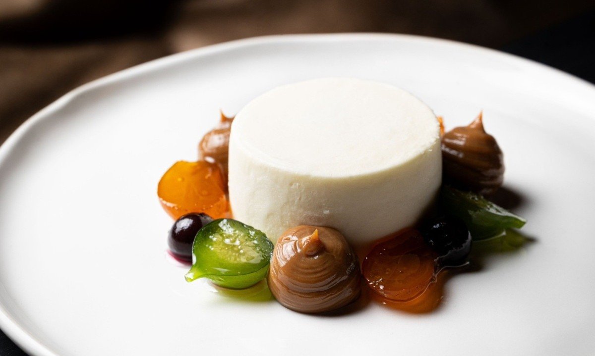 Mousse de queijo de cabra com compotas e doce de leite do Trintaeum