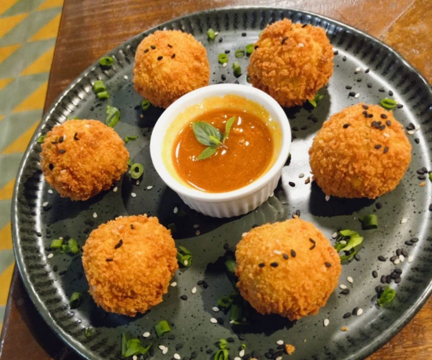 - Prato: bolinho de arroz temperado com açafrão, crocante por fora e macio por dentro, recheado com ragu de linguiça de pato e ora-pro-nóbis. Acompanha redução de tucupi agridoce e levemente picante.