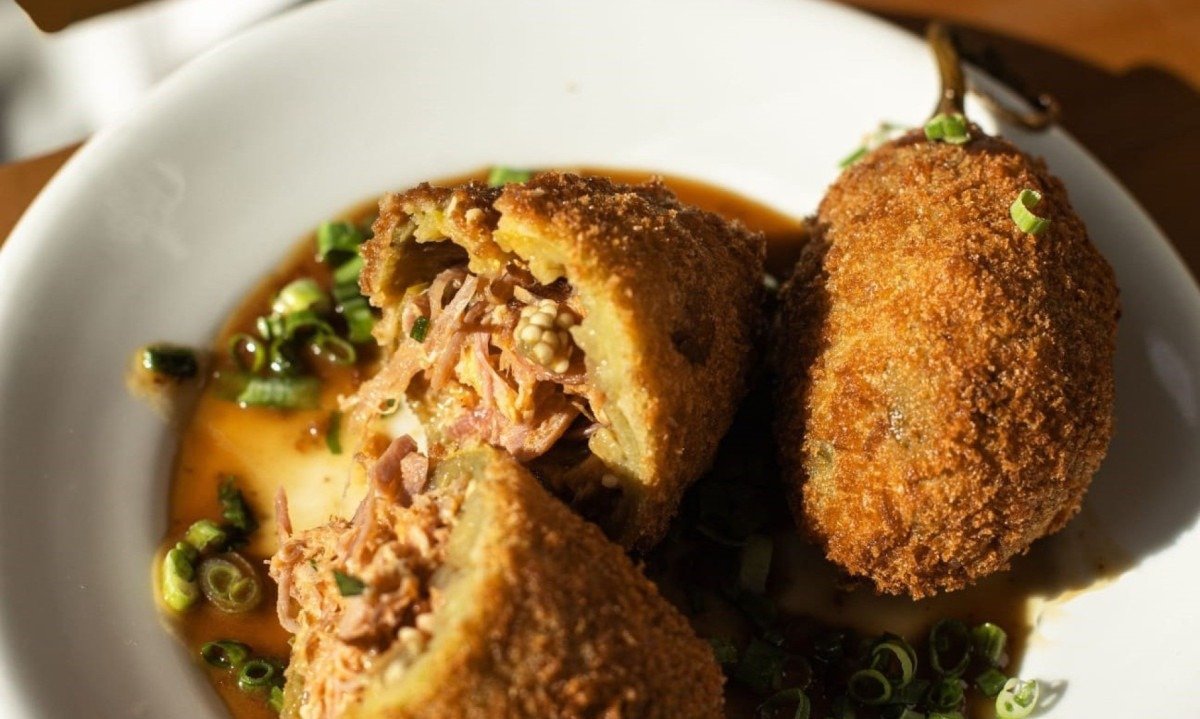 Um dos itens que chama a atenção no cardápio é o pão de queijo com crosta de queijo Canastra, recheado com creme de requeijão de raspa e queijo Canastra, finalizado com mel e pimenta.