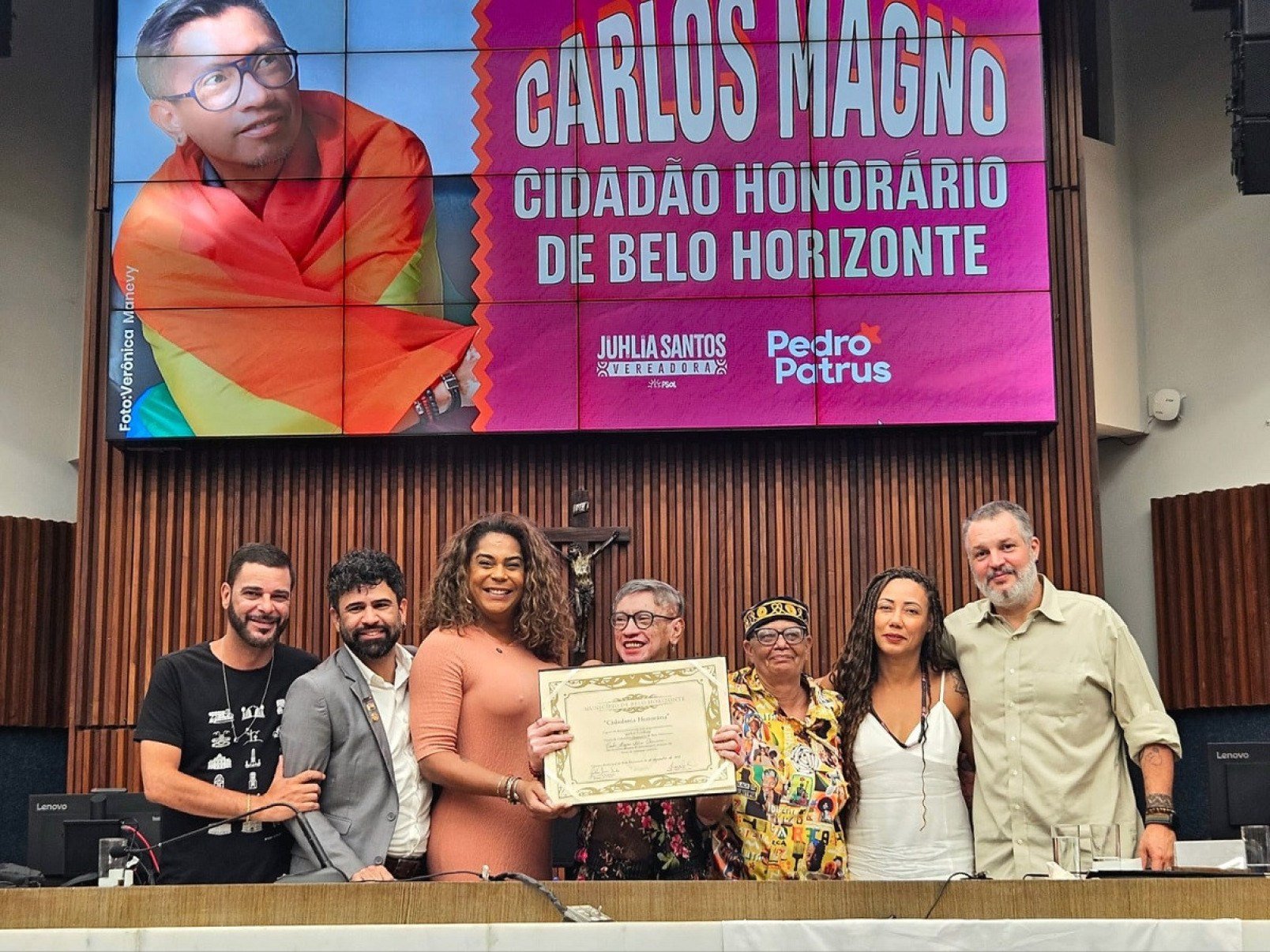 Durante a cerimônia, o vereador Pedro Patrus (PT) relembrou as mortes recentes de pessoas trans em Belo Horizonte - Alice Martins foi espancada na Savassi, e Christina Maciel foi morta pelo companheiro em Venda Nova, ambas neste ano. “A população LGBT ainda luta para sobreviver ao ódio e à intolerância”, protestou o vereador. Para ele, a atuação de Carlos Magno “nasce do desejo de liberdade, não somente da sexualidade, mas pela democracia e por direitos”. “É uma das pessoas mais reverenciadas por sua contribuição ímpar nas questões LGBTQIAPN+”, completou.