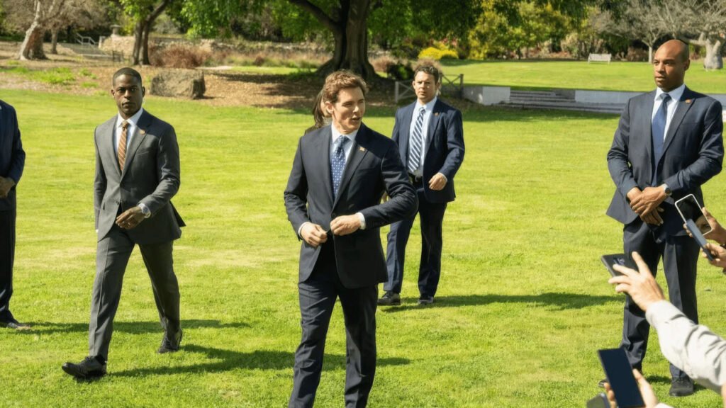 Sterling K. Brown ancora a série com performance que equilibra vulnerabilidade e autoridade como agente do Serviço Secreto Xavier Collins. Sua colaboração prévia com Fogelman em “This Is Us” criou confiança mútua que permite exploração de nuances emocionais complexas. Brown também atua como produtor executivo, demonstrando investimento pessoal no projeto que transcende sua participação como intérprete.