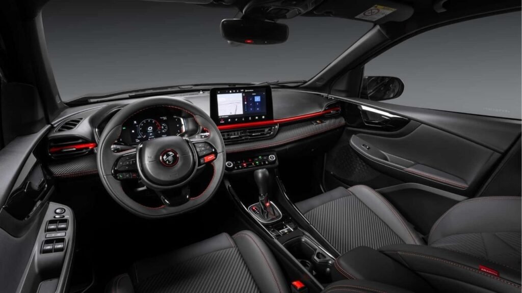 O interior do Pulse Abarth 2026 foi projetado para oferecer uma atmosfera esportiva e sofisticada. Os bancos possuem revestimento em couro sintético com costuras vermelhas aparentes, enquanto o volante multifuncional exibe o emblema da Abarth ao centro. Detalhes em fibra de carbono e acabamento em preto brilhante reforçam o apelo visual, criando um ambiente envolvente para motorista e passageiros. Uma novidade é que o modelo passa a oferecer iluminação ambiente em LED personalizável, trazendo ainda mais estilo à cabine.