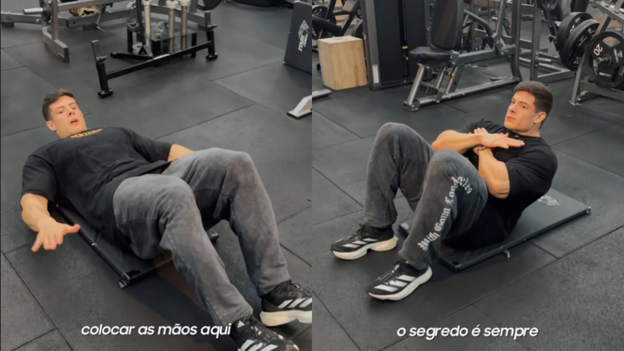 O abdominal supra, tradicional e conhecido, deve ser feito com atenção à respiração. Breno recomenda soltar o ar durante a subida e manter o abdômen contraído, evitando forçar o pescoço ou a lombar. O movimento deve ser curto e preciso, com o foco total na parte superior do abdômen.