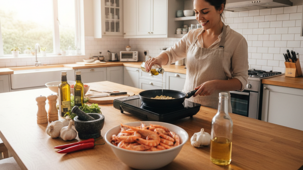Quais são os ingredientes essenciais e como preparar camarões ao alho?