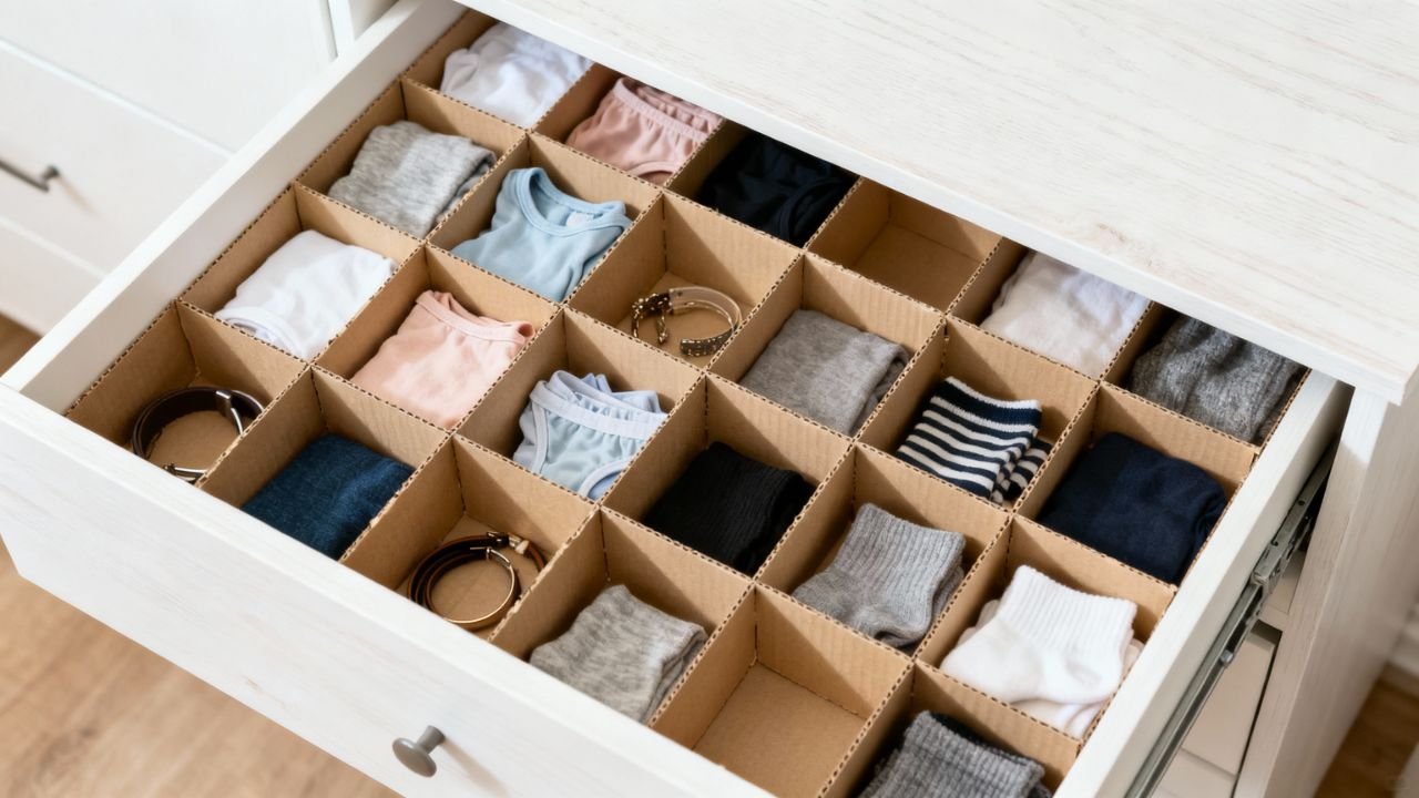 Com papelão e fita adesiva, é possível criar um organizador de gavetas sob medida, prático e sustentável. Essa solução transforma caixas usadas em divisórias funcionais para manter tudo no lugar sem gastar nada.