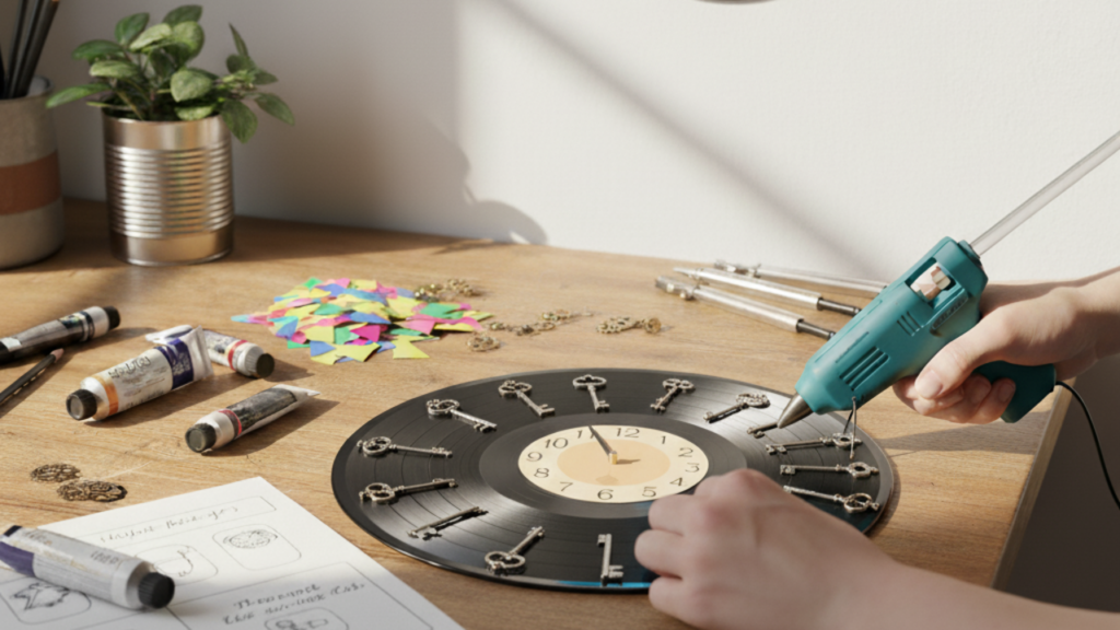 Depois, corte e lixe os palitos de madeira para usá-los como marcadores de hora. Eles são fixados no vinil com cola quente, e, após a secagem completa, o mecanismo do relógio deve ser centralizado e instalado corretamente, garantindo que os ponteiros funcionem bem.