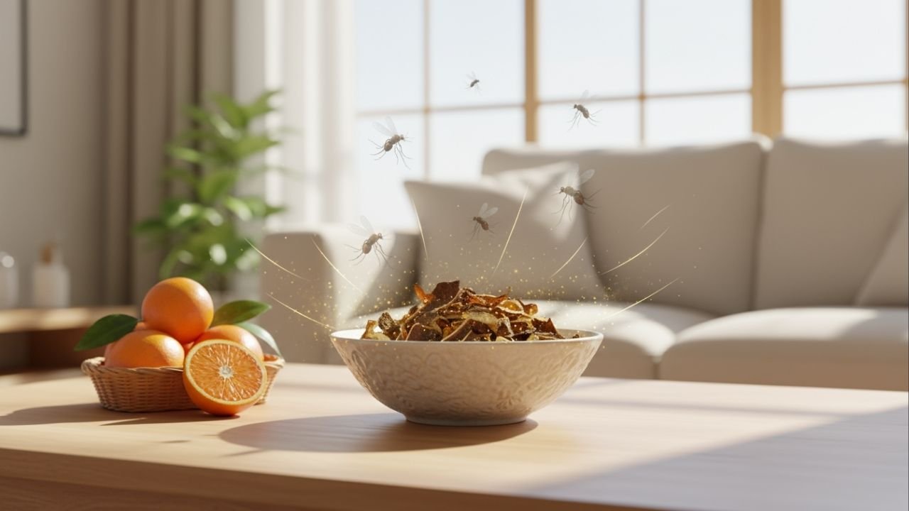 A casca seca de laranja libera um aroma cítrico intenso capaz de repelir mosquitos de forma natural e eficiente, criando um ambiente mais protegido sem o uso de produtos químicos agressivos.