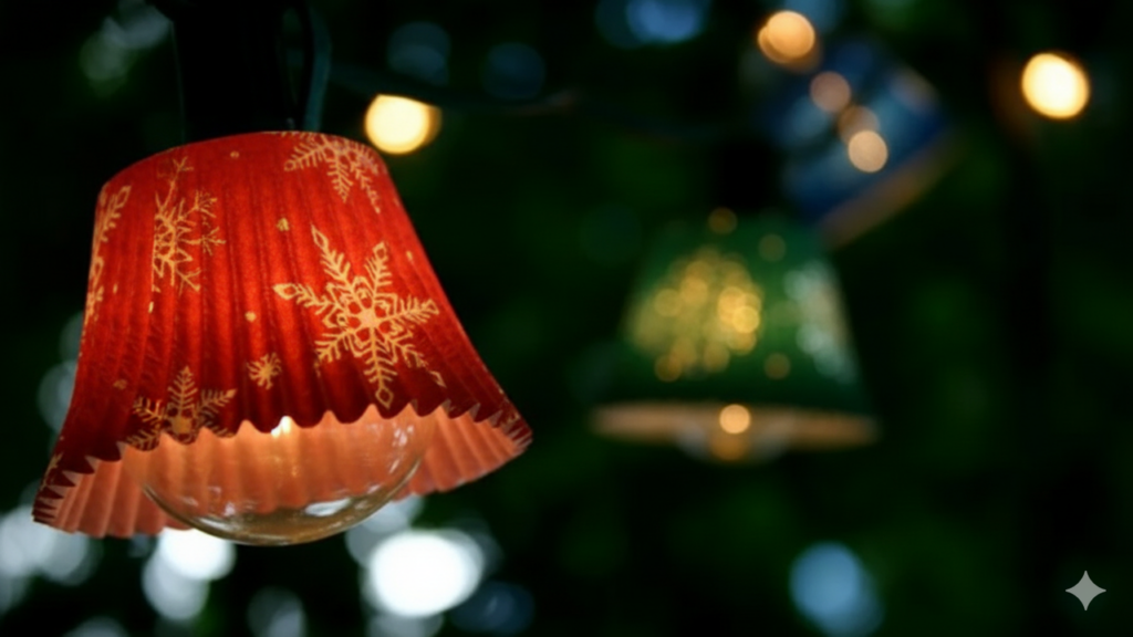 Além de enfeites, as forminhas podem servir na confecção de luzes natalinas decorativas. Essa alternativa proporciona uma decoração inovadora usando apenas o que você já possui em casa.