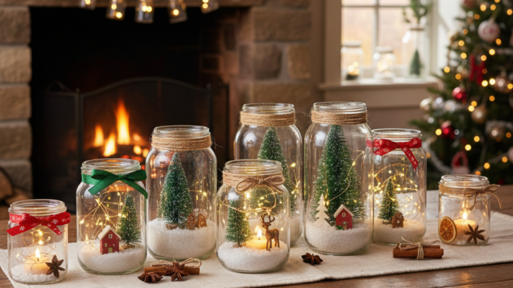 Depois, basta incluir pequenas miniaturas, como árvores, casas ou animais temáticos. Feche o pote ou deixe-o aberto conforme preferir. Assim, você surpreende convidados e valoriza o clima natalino. Confira exemplos práticos de miniaturas para compor esse cenário: