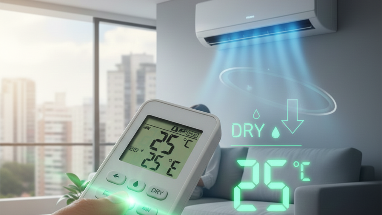 O modo “Dry” está presente na maioria dos controles remotos de ar-condicionado, geralmente identificado com a palavra “Dry” ou um ícone de gota. Sua principal função não é resfriar, mas reduzir a umidade do ar, tornando o ambiente mais confortável mesmo sem grandes quedas de temperatura.